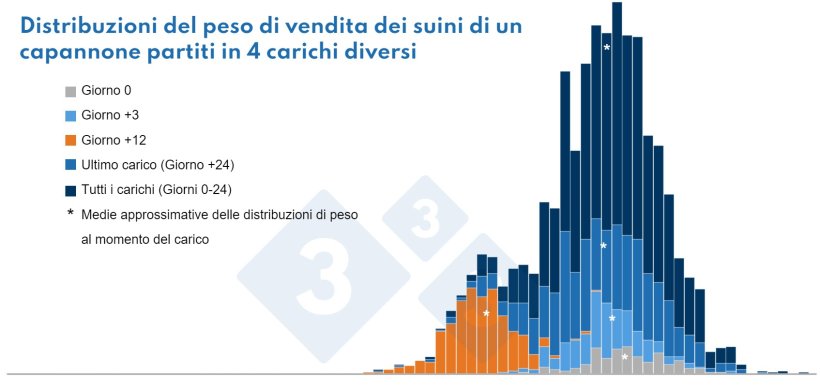 Se osservi i pesi di carico sul grafico, noterai che la distribuzione è bimodale e che il lato sinistro della media è più ampio del lato destro. Quando si osserva una distribuzione bimodale (due modi, cioè due picchi), ciò indica che erano in corso almeno due diversi "processi produttivi" nello stesso capannone. Ciò può essere dovuto ad un gruppo di suini malati, suini di diversa genetica o sesso, diverse entrate, alcune parti del capannone che mantengono un ambiente diverso (ventilatori non funzionanti, zone umide, ecc...).