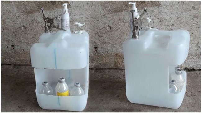 Tre tubi in plastica sono fissati con dei bracciali al secchio: sono i contenitori delle tre siringhe in uso: due per antibiotici (due prodotti diversi a seconda della patologia) ed una per l'antinfiammatorio. La lunghezza del tubo è calcolata secondo la lunghezza della siringa, ago compreso, in modo che quando si posiziona all'interno l'ago non tocca il fondo e quindi non si rovina. Le staffe esterne consentono di appoggiarlo ai bordi dei box, a "livello uomo", quindi agevole da utilizzare.