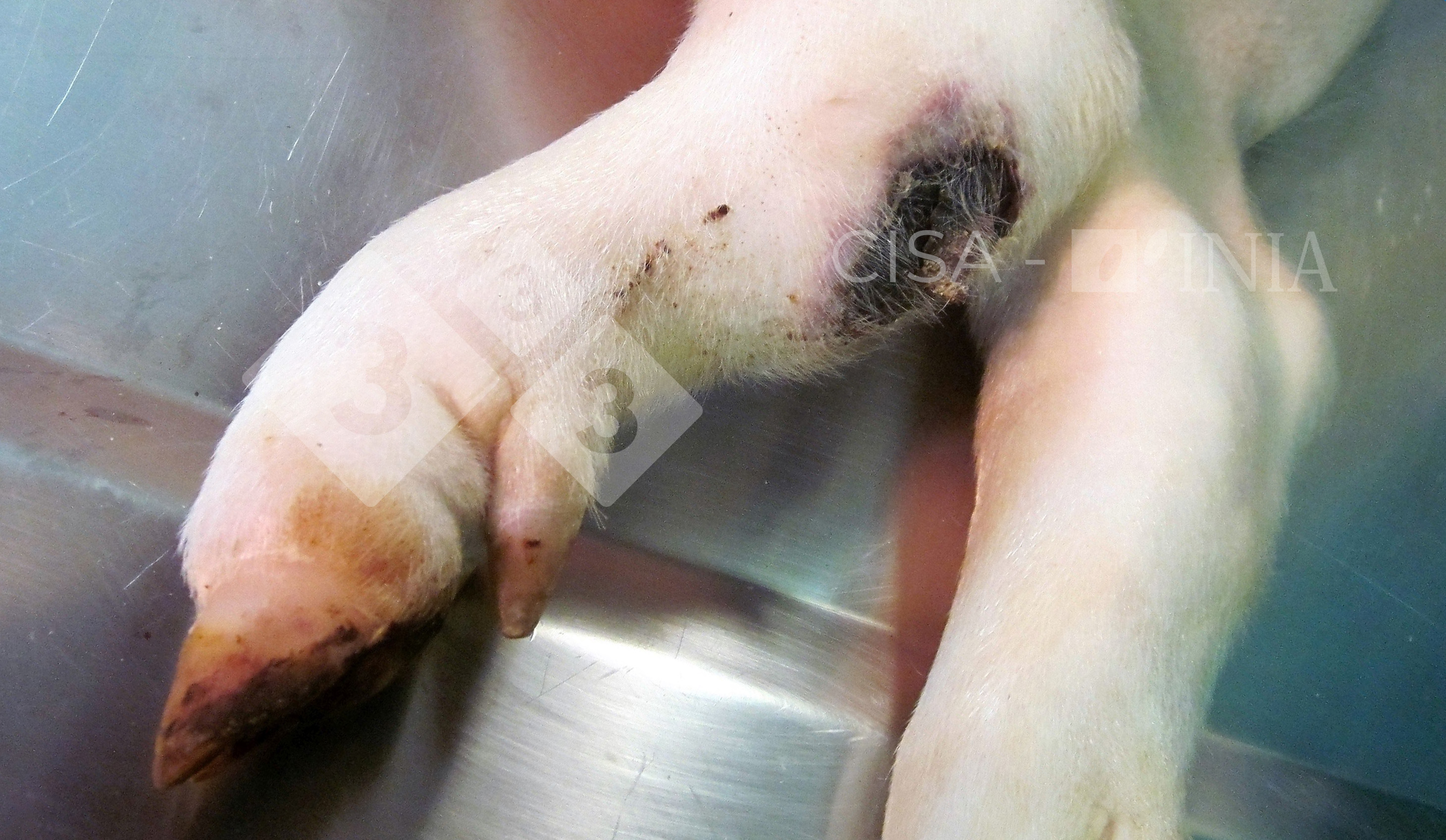 La foto mostra un'area necrotica ed un aumento di volume del metatarso sinistro. Si tratta di un quadro clinico cronico di peste suina africana, 35 giorni dopo l'infezione sperimentale. Il suinetto mostrava febbre transitoria ricorrente elevata (> 40 Cº) che è durata 20 giorni, assieme all'aumento del volume dell'articolazione (da moderata a grave) con zone cutanee rossiccie che diventarono necrotiche e sopraelevate.