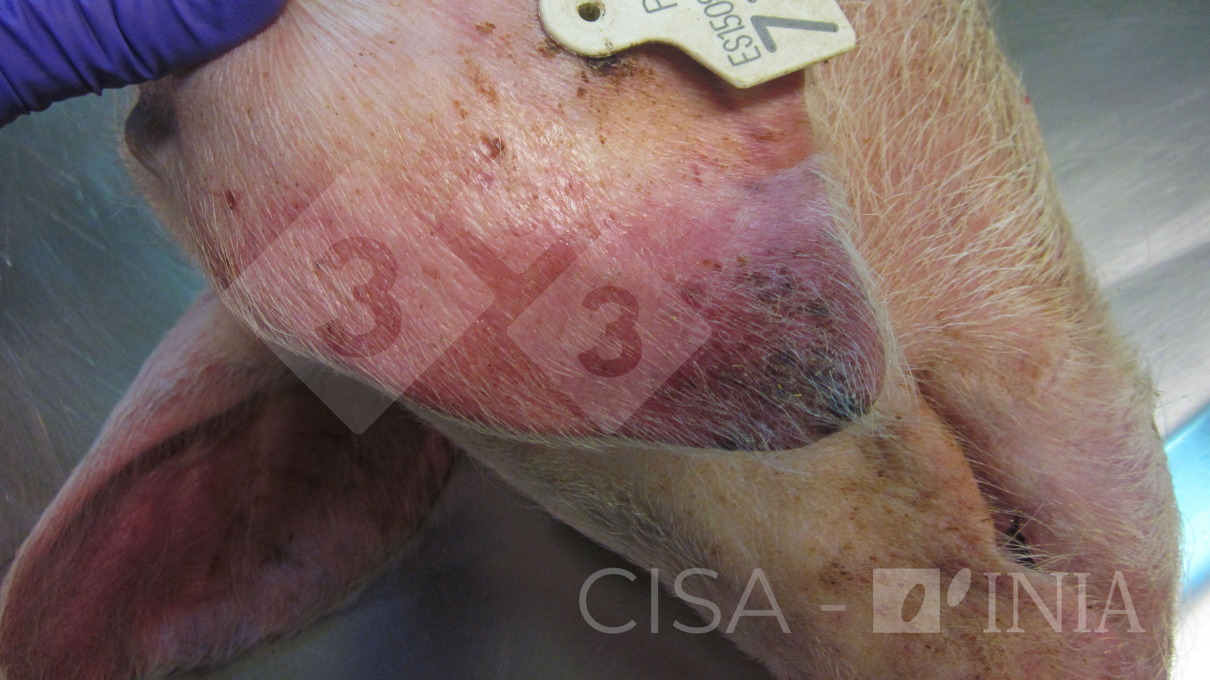 Lesioni cianotiche sulla punta delle orecchie di un animale colpito dalla peste suina africana. L'animale aveva febbre alta e apatia. Inizialmente il rossore si verifica a causa di iperemia che si evolve in cianosi. Le aree cianotiche possono anche verificarsi in altre parti del corpo come la coda, la parte distale delle estremità, il torace o l'addome.