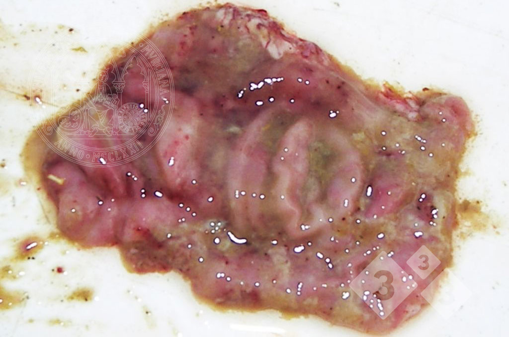 Porzione del colon di un suino iberico da ingrasso in cui la mucosa appare ispessita e su di essa compaiono resti di muco e sangue. È una colite muco-emorragica prodotta dall'infezione da Brachyspira hyodysenteriae. Lesioni molto simili possono essere causate da B. pilosicoli. In entrambi i casi, è interessato solo l'intestino crasso.