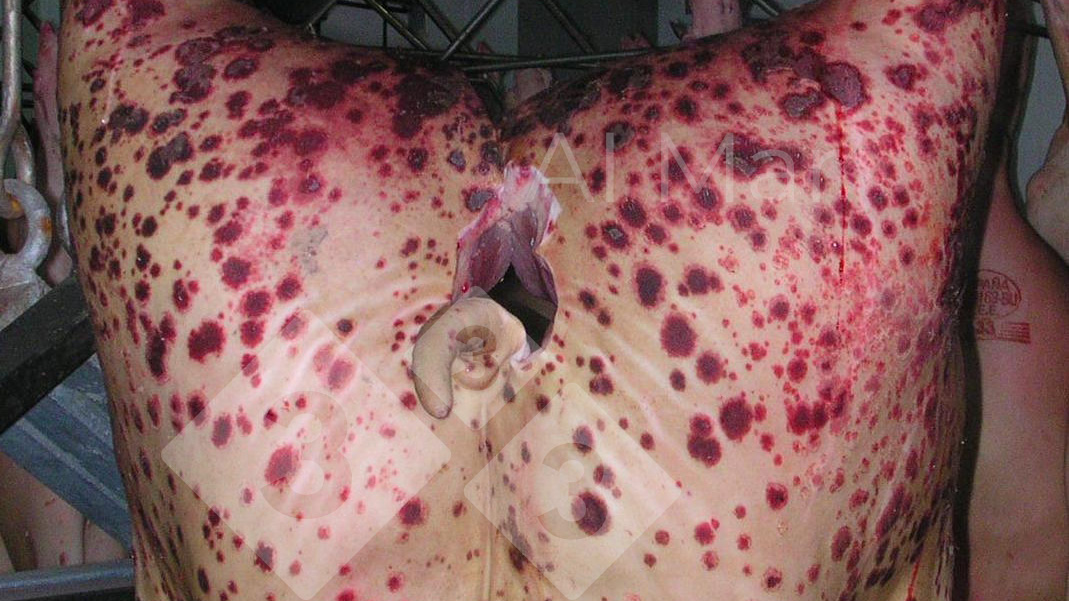 Si tratta di un caso della sindrome della dermatite nefrite suina(PDNS). Le lesioni osservate in questo suino dopo la macellazione è una dermatite emorragica necrotizzante: le lesioni sono di colore rosso-viola con il centro marrone scuro.
