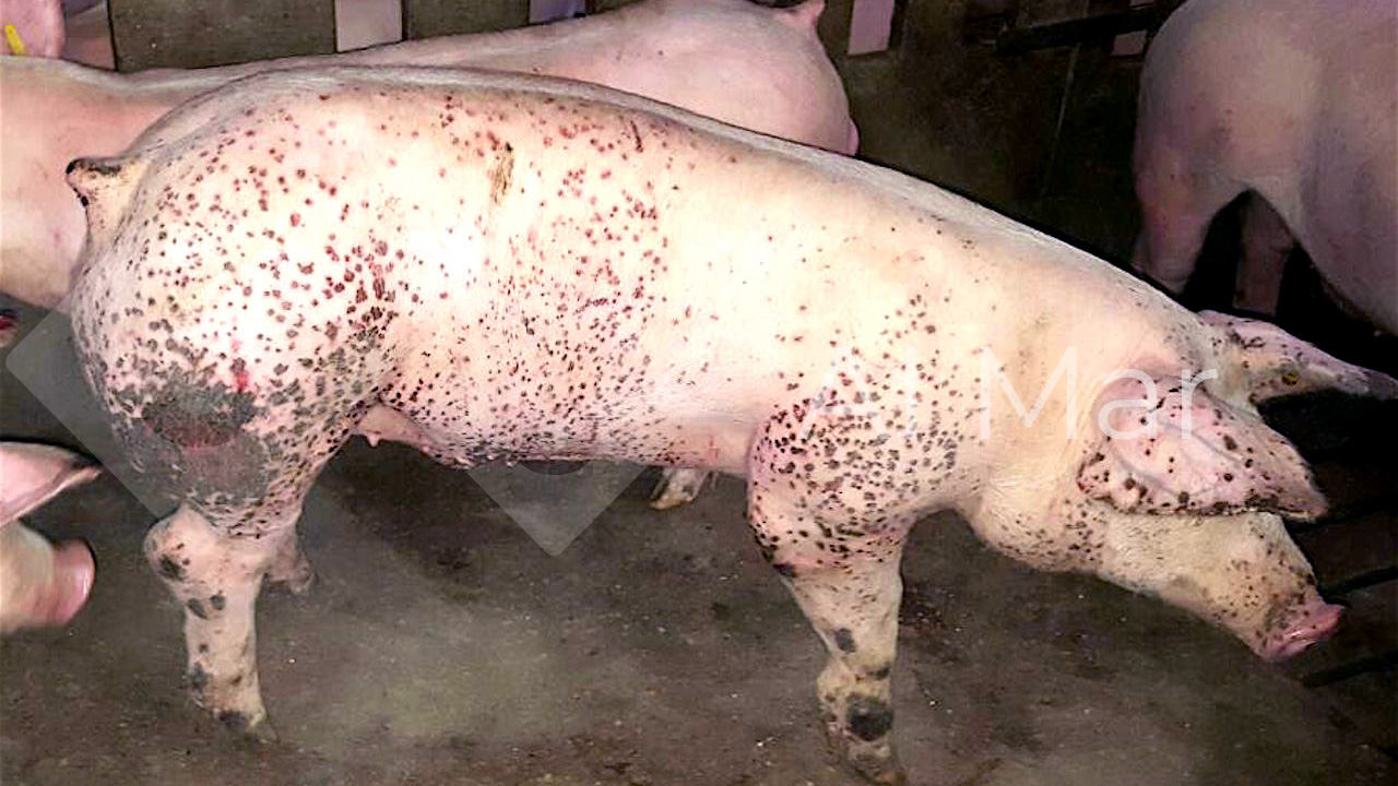 La lesione osservata sulla pelle di questo suino grasso è una dermatite emorragica localizzata sopratutto nella zona perineale, alle estremità posteriori e più lievemente sull'addome ed agli arti anteriori, finendo alle orecchie...