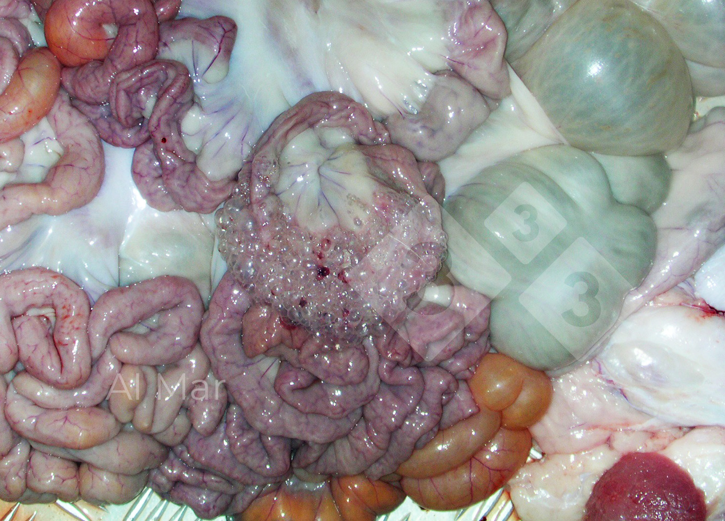 Nell'unione dell'intestino piccolo con il mesenterio si osservano queste vescicole trasparenti ripiene d'aria. Non si formano nell'animale vivo e non è associato a nessun patogeno, quindi, non sembra contagioso nè per il suini nè per l'uomo. E' un reperto post-mortem in un suino di 100 kg di peso vivo, raramente osservato nei macelli dove presentano aspetto spiacevole, motivo per il quale viene tolto dal consumo.