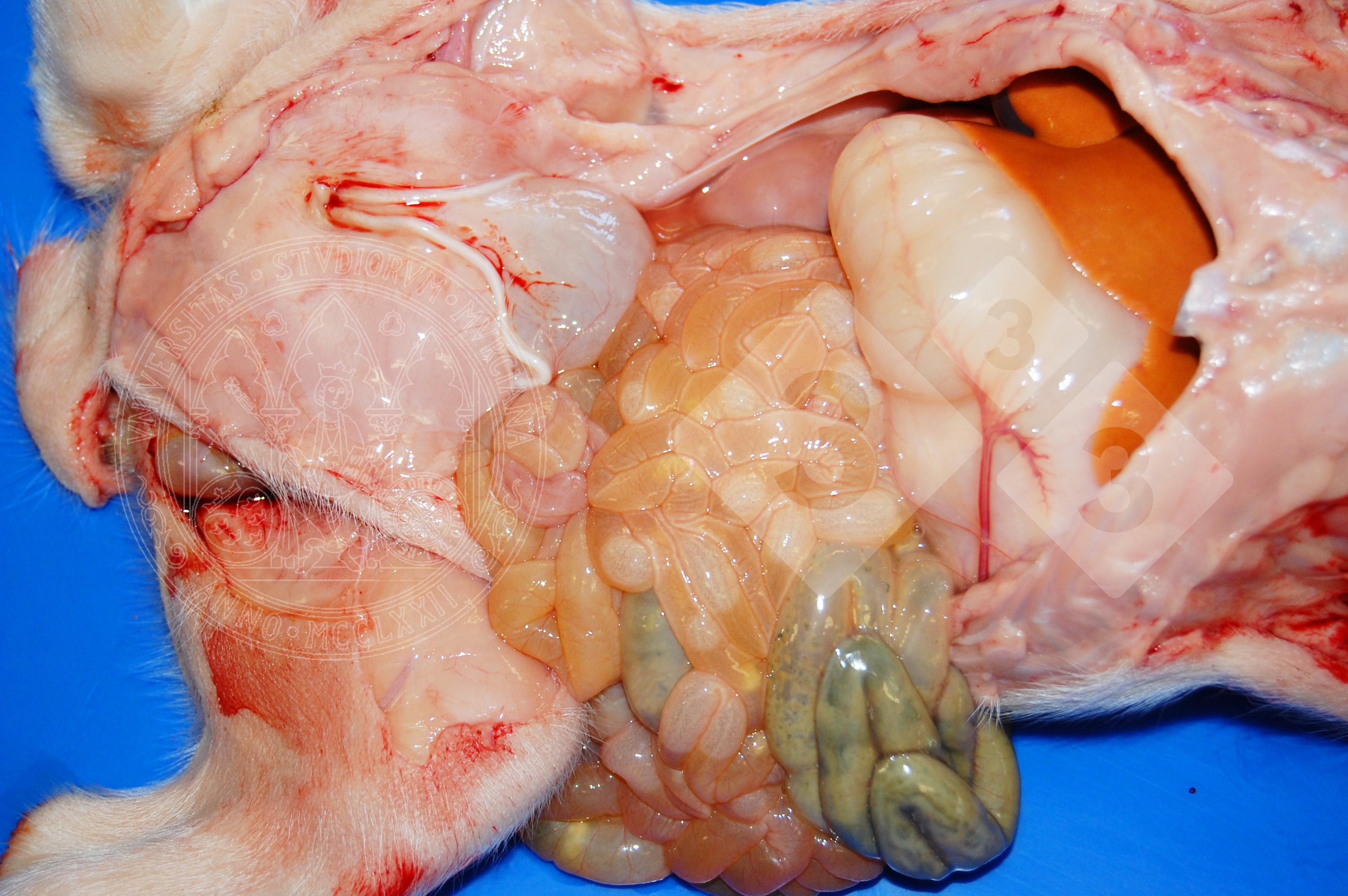 Immagine dell'intestino tenue di un suinetto con diarrea, le cui pareti appaiono flaccide, molto sottili e con contenuto acquoso. Microscopicamente, la lesione osservata è atrofia e fusione di villi e vacuolizzazione degli enterociti apicali. Questa lesione è caratteristica delle infezioni da virus enterici come il rotavirus ed il coronavirus. Nei casi di malattie come la sindrome di mancanza di sviluppo nel peri-svezzamento (PFTS, per il suo acronimo in inglese) appare anche macroscopicamente la parete assottigliata ed a livello microscopico c'è atrofia e fusione di villi. La diagnosi è: enterite catarrale atrofica.