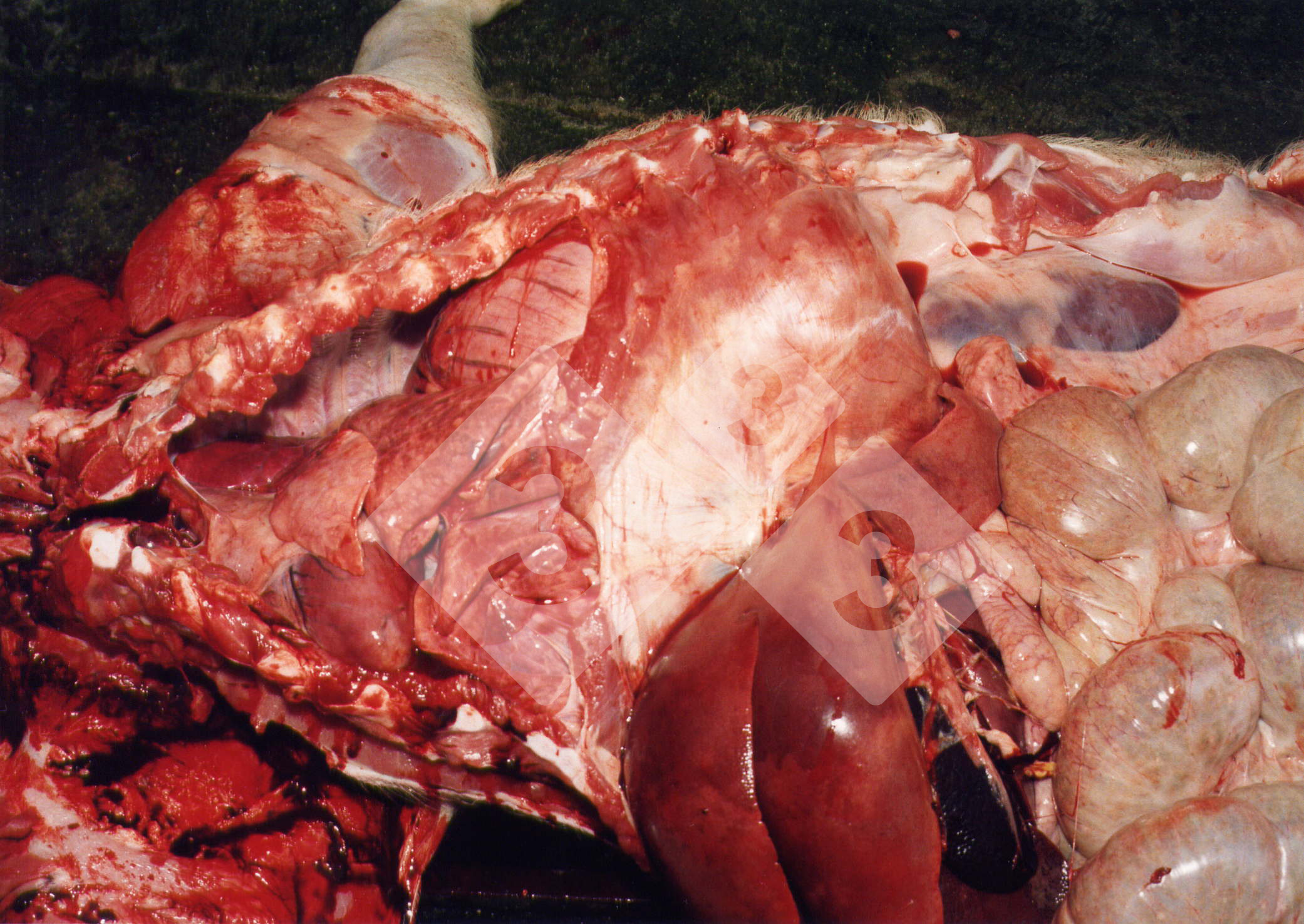 Morte improvvisa di questo suino di 8 settimane di età, che presentava una carcassa di buon aspetto, ma che alla necroscopia ha evidenziato la presenza dello stomaco nella cavità toracica.