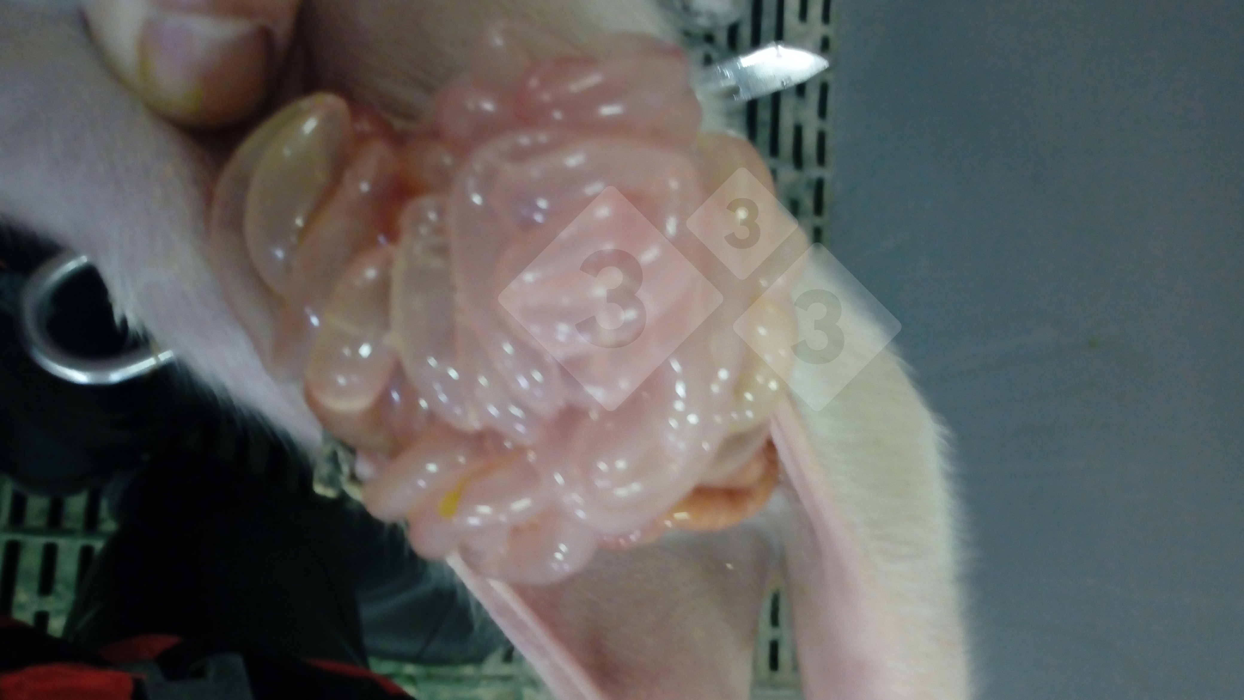 Diarrea da rotavirus. Intestino traslucido nei suinetti in allattamento a causa della distruzione dei villi intestinali come conseguenza della replicazione del virus.