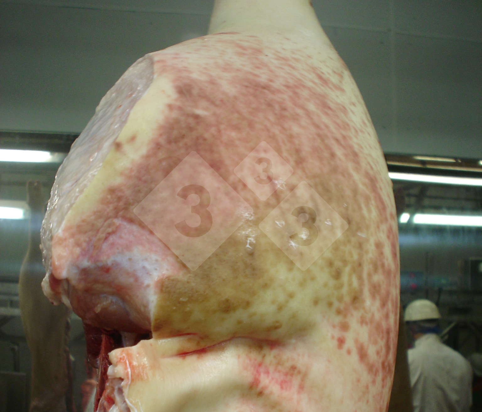 Condizione cutanea denominata Eritema post-trasporto (bruciatura da urina). Il contatto con l'urina e lo stress dal trasporto provocano un'arrossamento cutaneo o una decolorazione della pelle; può anche essere causato per irritazioni da contatto con segatura o disinfettanti.