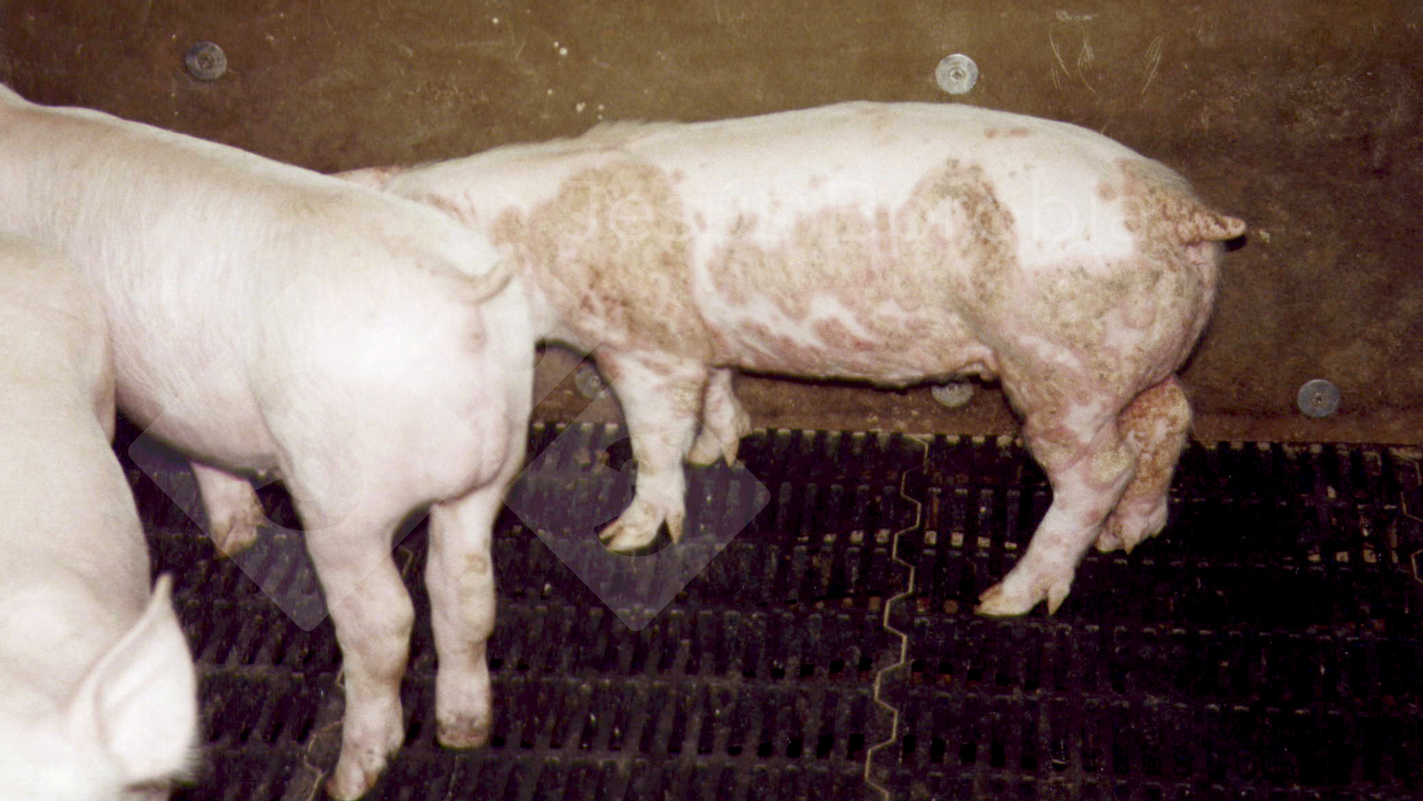 Grandi lesioni coalescenti similari alla tigna localizzate all'addome e ad arti anteriori e posteriori. Si tratta di pitiriasis rosea, una malattia sporadica in suinetti giovani da 3 a 16 settimane di età. Si crede che abbia una componente ereditaria...