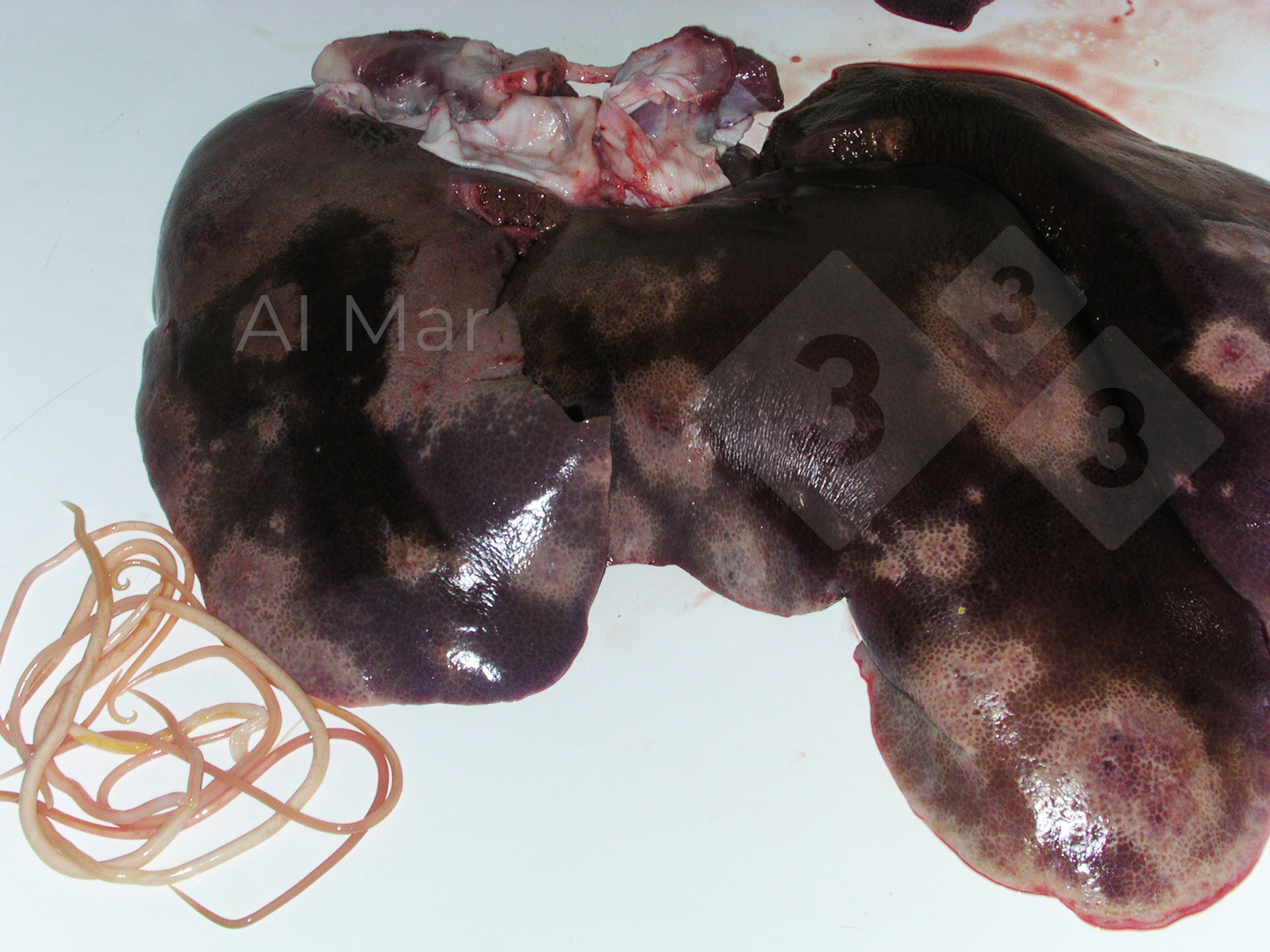 Questo fegato presenta macchie biancastre prodotte dal passaggio di larve di Ascaris suum che hanno raggiunto il parenchima epatico attraverso il sistema portale. Le macchie hanno bordi diffusi con penetrazione in profondità nel parenchima epatico. I vermi adulti si trovano nell'intestino e possono raggiungere 4-5 mm di spessore e 15-25 cm di lunghezza. Le forme adulte dell'immagine appartenevano allo stesso animale del fegato colpito.
