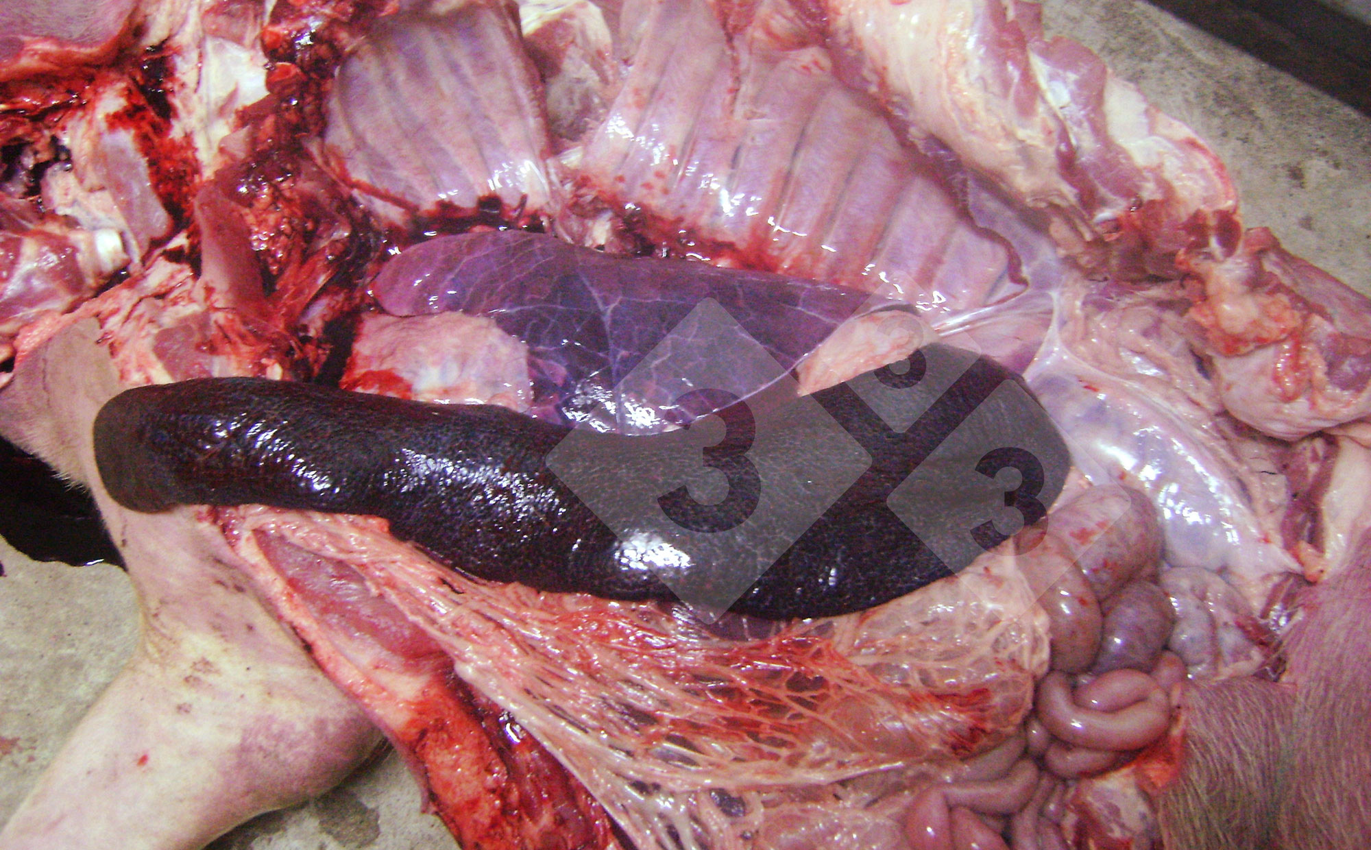 Questa lesione post-mortem è stata riscontrata in un suino morto improvvisamente. Una elevata percentuale dei suini presentavano febbre alta ed apatia. Ci sono stati aborti e suini con macchie cianotiche sulla cute.