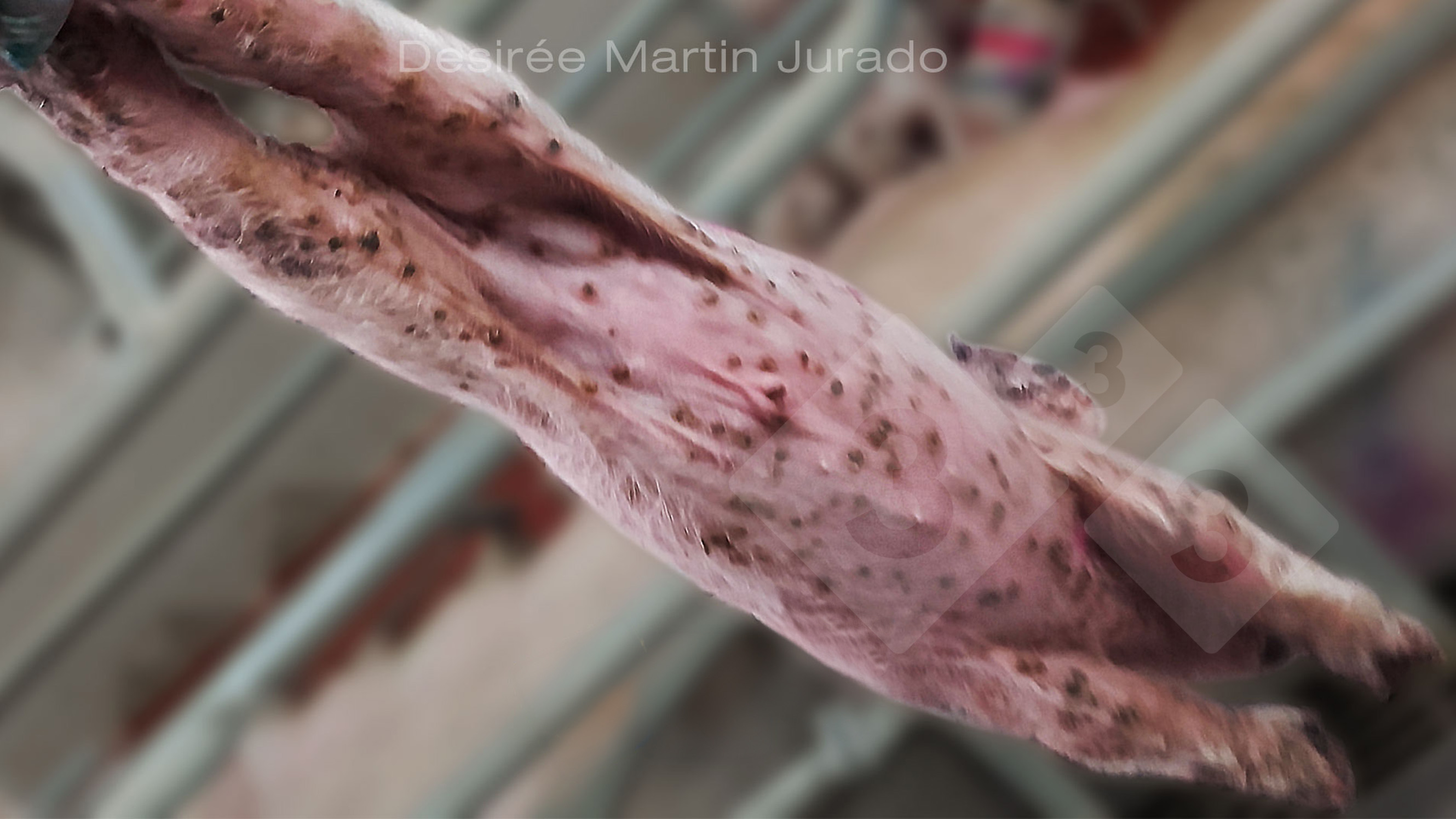 Suinetto affetto da poxvirus (vaiolo suino). Si osservano lesioni cutanee multiple distribuite su tutta la cute del suinetto, papule, pustole ed erosioni tra 0,2 e 1 cm di diametro. Lesioni erosive o ulcerative nelle orecchie, nel viso e nelle estremità dei suinetti di più di un giorno di vita. Il problema si è verificato in figliate isolate e molto sporadicamente...