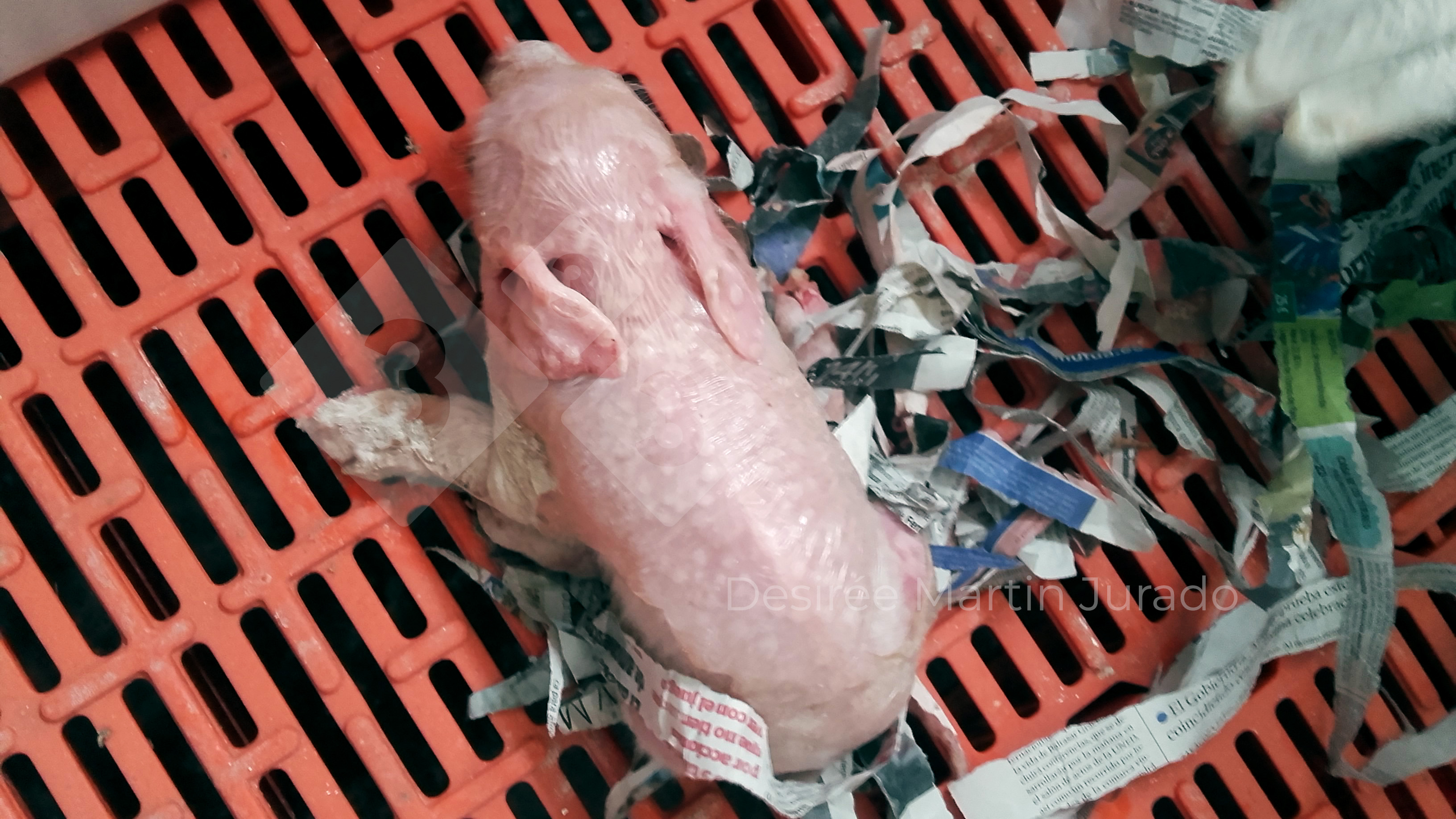 Questo suinetto appena nato presenta lesioni cutanee distribuite su tutta la pelle con presenza di papule. Questo suinetto ha il vaiolo (poxvirus). E' stato osservato in figliate singole ed in forma sporadica...