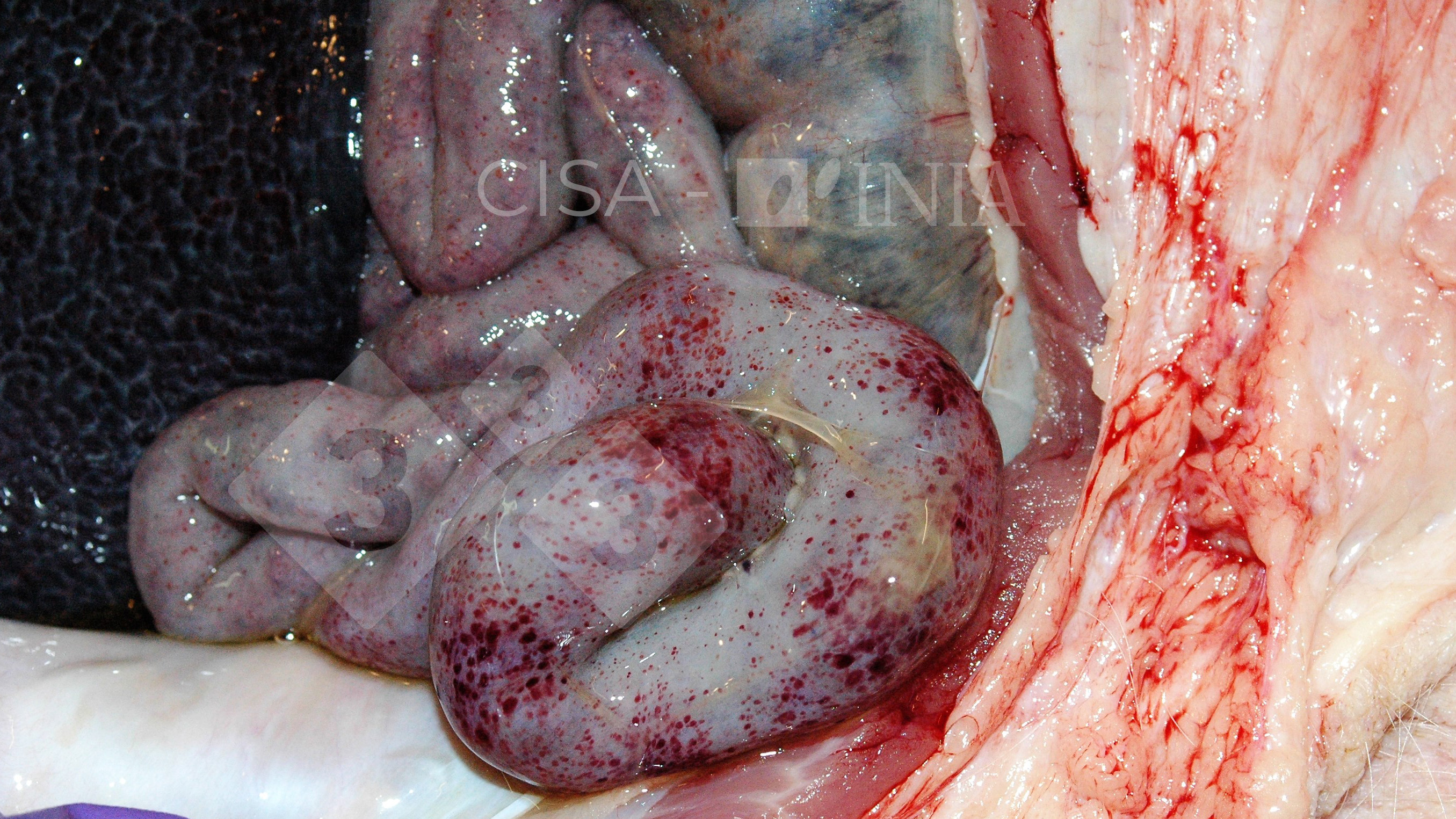 Piccolo intestino con emorragie petecchiali sulla sierosa e mucosa. Si tratta di un quadro acuto di peste suina africana osservato 2 giorni dopo un'infezione sperimentale. Il soggetto presentava febbre alta (> 41 Cº) anoressia e prostrazione...