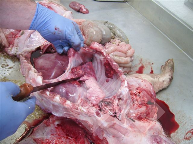 Da questo polmone si è isolato l'Haemophilus parasuis (malattia di Glässer) con lesioni necrotiche al lobo diaframmatico e pleuriti.