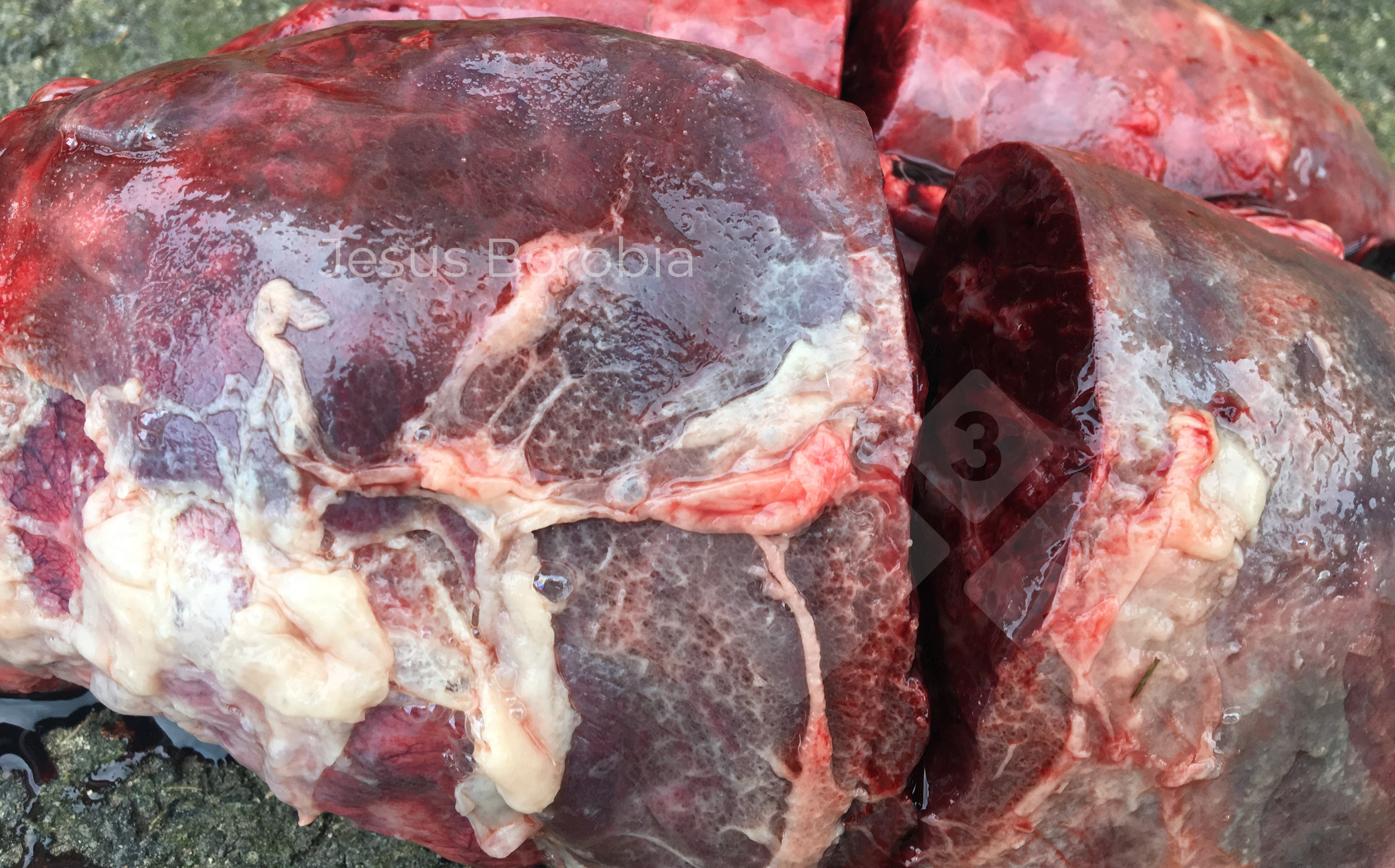 La pleuropolmonite fibronecrotica è stata rilevata durante la necroscopia. L'agente causale in questo caso era l'Actinobacillus suis. L'actinobacillosi colpisce generalmente solo i suinetti, ma potrebbe interessare i suini più adulti se la PRRS è attiva in allevamento. In questa unità di produzione, PRRS e PCV-2 non erano controllati, il che consentiva ad Actinobacillus suis di causare danni opportunistici...