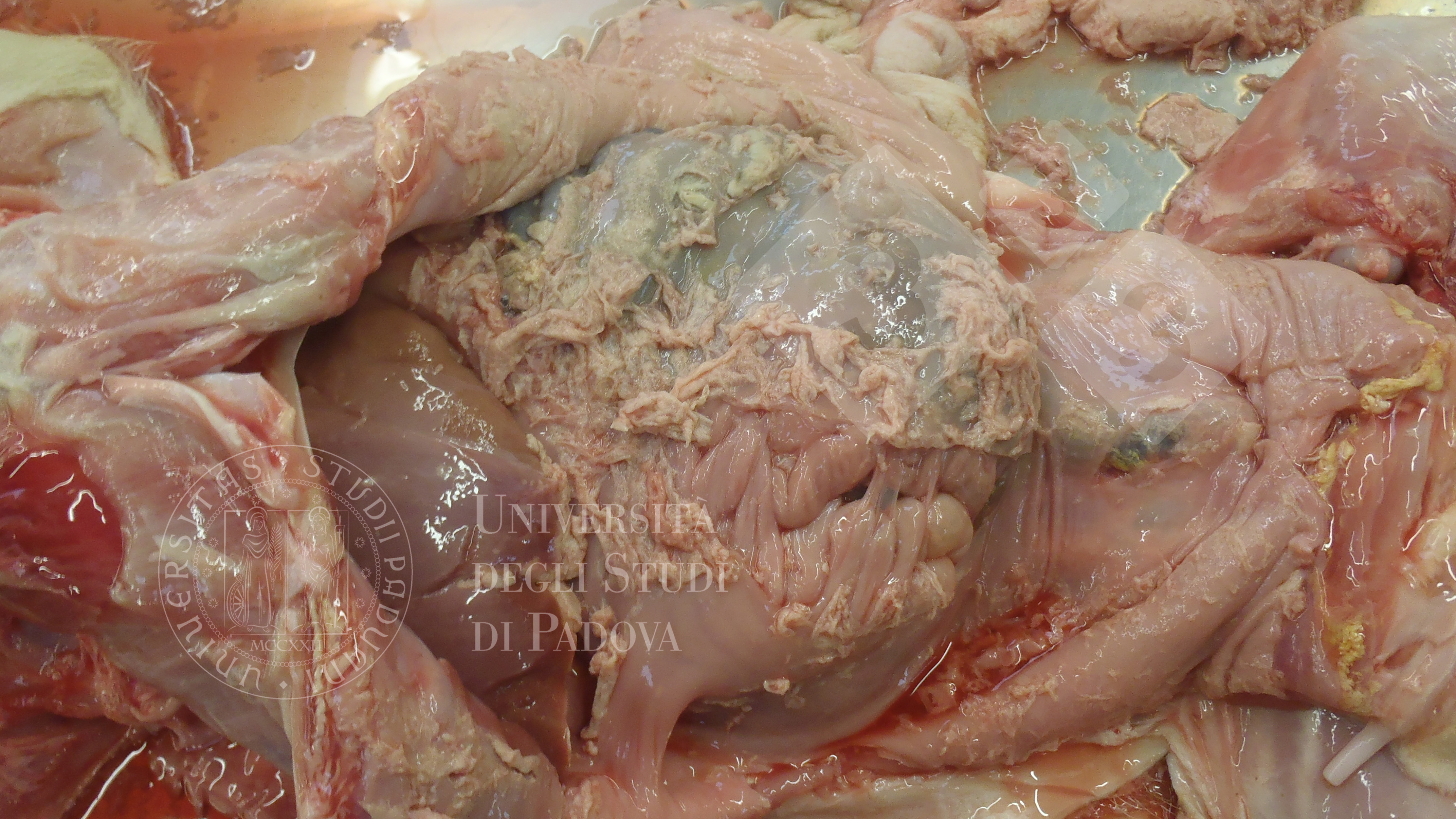 Gli organi peritoneali sono ricoperti da un essudato fibrinoso di colore giallastro, diffuso, corposo e ben organizzato. Questa peritonite cronica, grave e diffusa è stata rinvenuta nell'addome e nelle altre cavità sierose (pericardio e pleura). Questi risultati sono compatibili con la malattia di Glässer (polisierosite) causata dall'Haemophylus parasuis. Questa malattia, occasionalmente, può coinvolgere le articolazioni ed il sistema nervoso centrale.