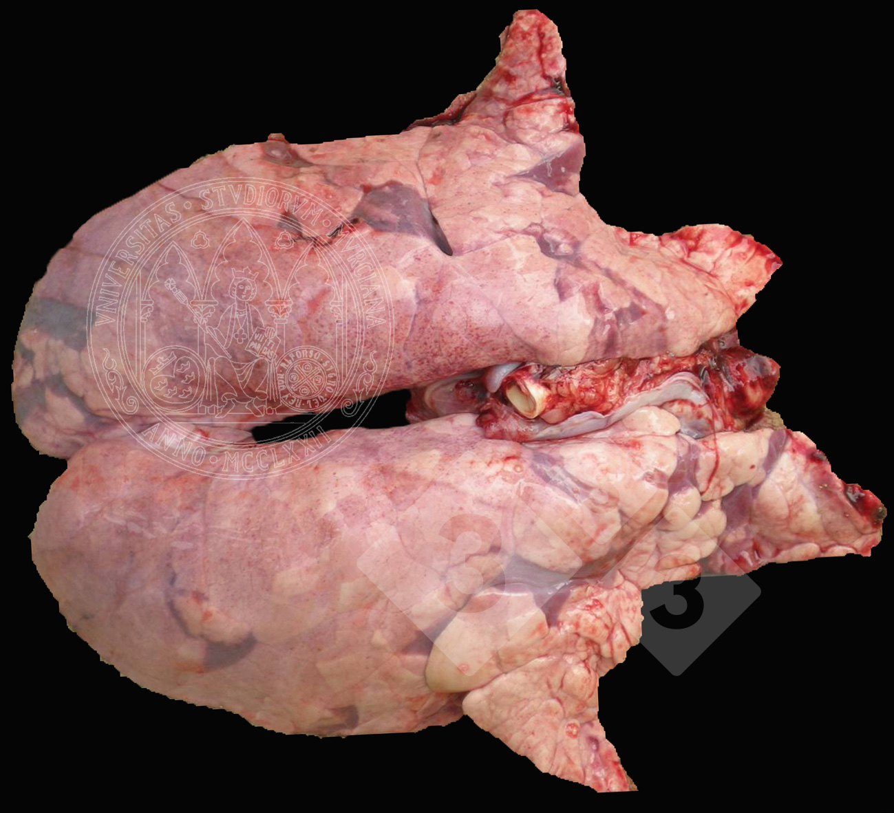 Polmone di un suino d'ingrasso con sintomatologia respiratoria che non collassa quando viene rimosso dalla cavità toracica con aree multifocali bruno-rossastre e aree di consolidamento cranio-ventrale rossastre. A livello microscopico, le lesioni osservate sono l'ispessimento dei setti alveolari a causa dell'infiltrato infiammatorio mononucleare, dell'iperplasia linfoide peribronchiale, peribronchiolare e perivascolare e dei polimorfonucleari neutrofili negli spazi. È una combinazione di polmonite interstiziale, broncointerstiziale e broncopolmonite purulenta in un caso di complesso respiratorio suino che è coinvolto il virus della PRRS, Mycoplasma hyopneumoniae e batteri secondari...