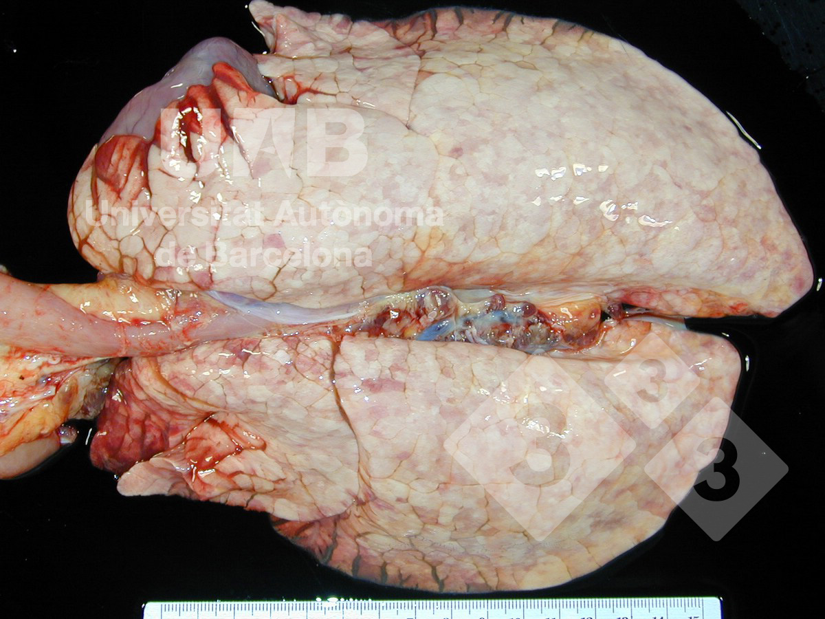 Questa lesione è una polmonite interstiziale. I polmoni non sono collassati, presentano edema importante, ed aree multifocali rossiccie o rosacee in corrispondenza delle infiammazioni che coinvolgono vari lobi. Le cause più comuni di questi tipi di lesione sono i virus, in particolare il PCV2, PRRSv ed Aujeszky.