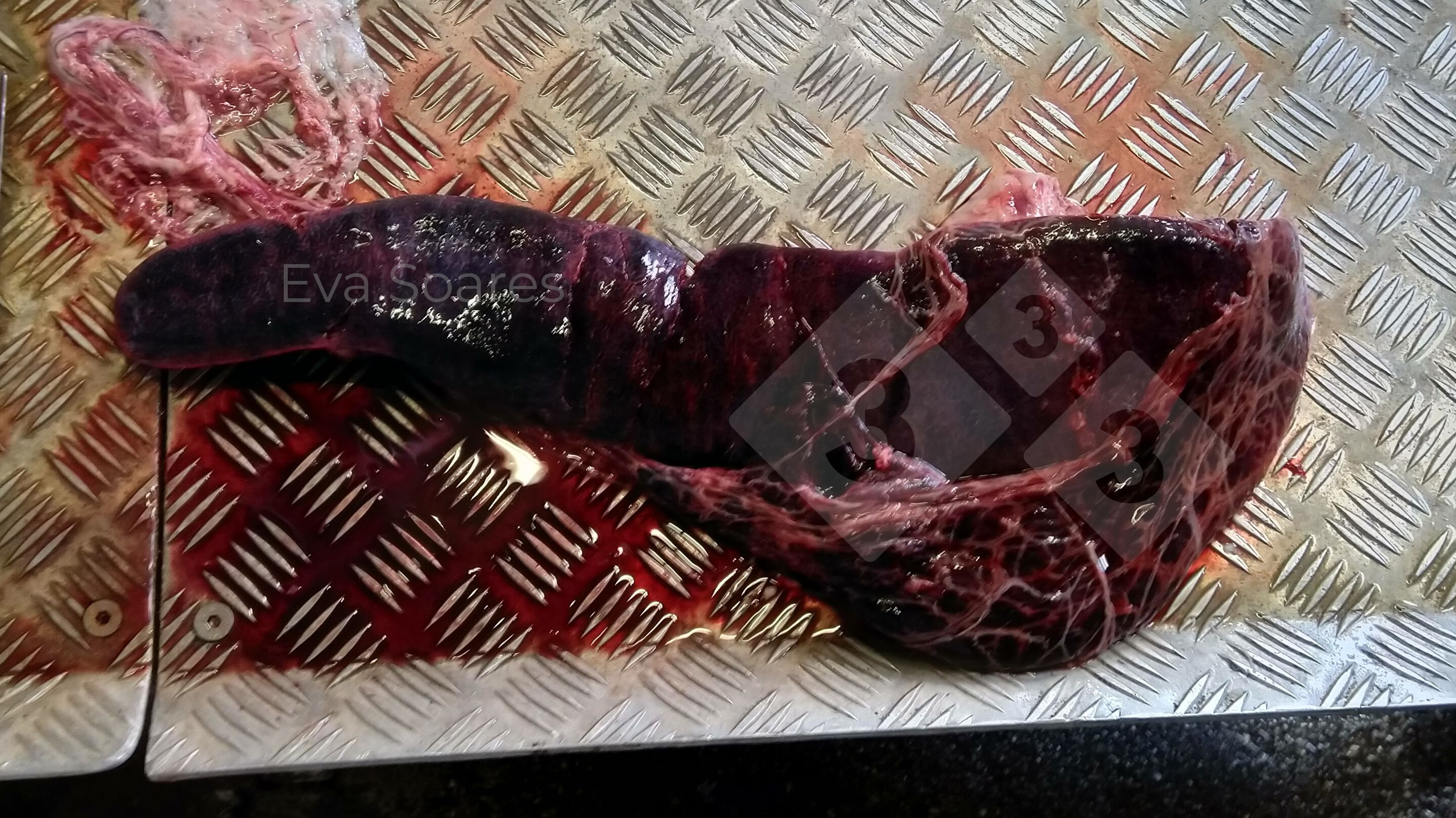 Lesione riscontrata in macello, in un suino grasso. La milza è molto ingrandita, congesta e con aderenze dell'omento. Al taglio presentava abbondante sangue rosso scuro (milza sanguinante). Questa lesione è secondaria alla compressione vascolare, sia all'ingresso che all'uscita della milza. Le cause più comuni della milza sanguinolenta, sono la congestione (torsione gastrica con imprigionamento splenico, torsione splenica, eutanasia con barbiturici, anestesia e sedazione), peste suina classica, peste suina africana, ipertensione portale e trombosi della vena splenica.