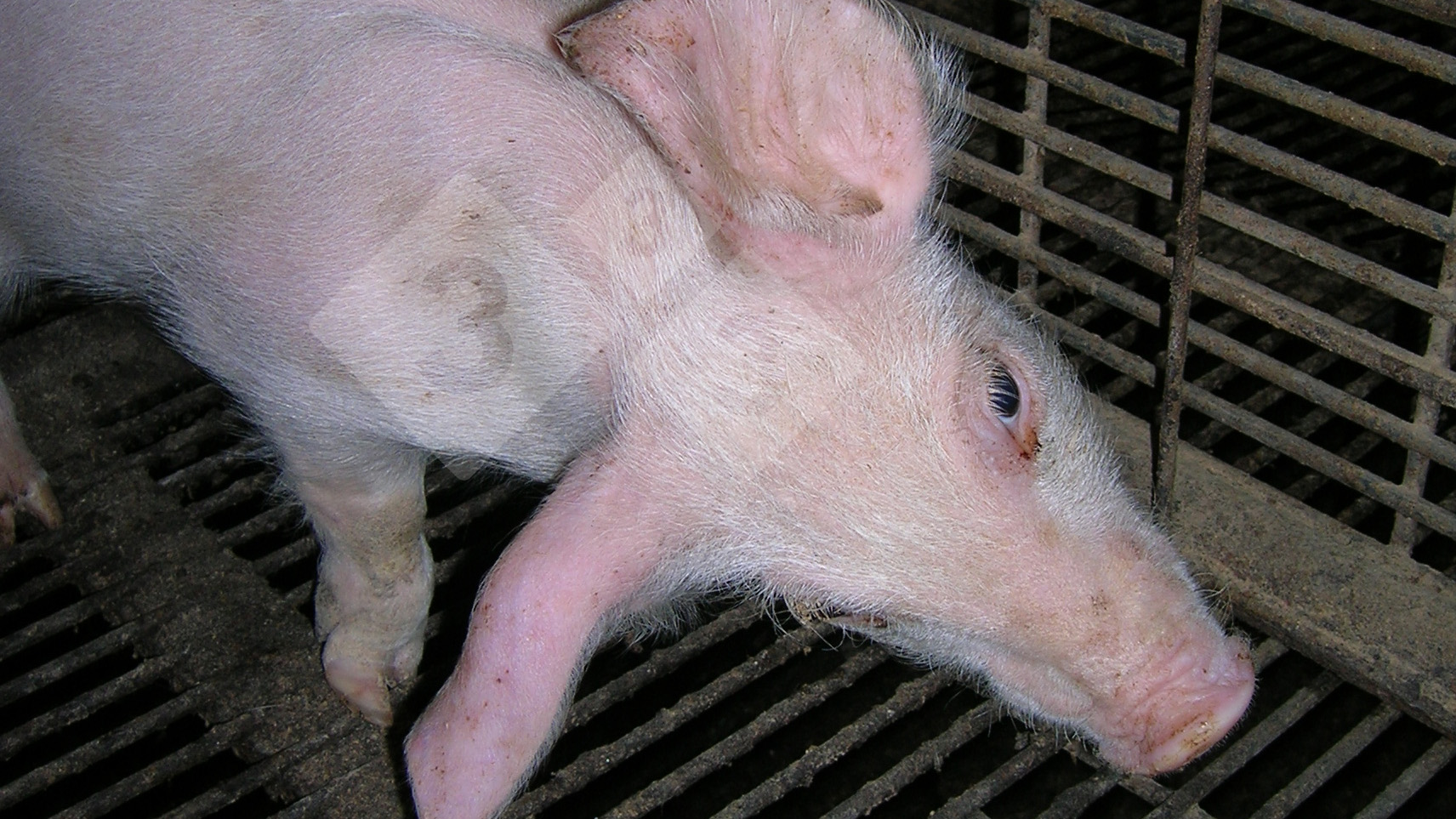Questo suino con la testa "storta" suggerisce un'infezione all'orecchio medio. Succede quando un'infezione raggiunge l'orecchio internamente producendo un ascesso o un nodulo. L'ascesso pressa dolorosamente, facendo sì che il soggetto penda la testa sul lato compromesso. L'infezione normalmente arriva all'orecchio medio mediante la connessione con il nasofaringe. Ci sono vari batteri che possono essere associati a questa lesione come:>Streptococcus spp. . Le infezioni all'orecchio medio non sono un problema frequente negli allevamenti di suini, e si vedono solo occasionalmente tra le 6 e 20 settimane di vita. I soggetti colpitii pendono la testa dalla stessa parte e a volte camminano in circolo: possono perdere l'equilibrio e cadere.
