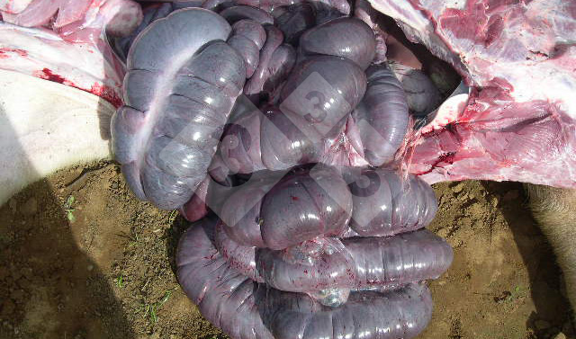 Si tratta di una torsione intestinale di un suino all'ingrasso. Normalmente gli adetti al lavoro informano che questi casi sono caratterizzati da morte improvvisa. La necroscopia dei suini colpiti evidenzia pallore e addome aumentato di volume. Nell'aprire la carcassa si deve avere molta cura: si osservano molte anse intestinali gonfie e tese, con contenuto gassoso e fluido sanguinolento. Queste anse intestinali possono presentare colori intensi dal purpureo al verdastro. Durante la necroscopia, si deve cercare sotto le anse, alla base del mesenterio intestinale e palpare le anse contorte. Il piccolo intestino del suino è molto lungo e si appoggia sull'addome inferiore quando il suino è in piede. In un suino attivo questo significa che sono frequenti le torsioni ed i giramenti che possono concludersi in un esito finale estremo, causando la morte improvvisa dell'animale. Si osserva in suini da ingrasso molto attivi, in momenti di eccesso di attività, che può sbocciare in litigi o anche con un'ingestione eccessiva di alimento. Altre patologie con aspetto similare sono: autolisi, enteropatia proliferativa o colibacillosi.