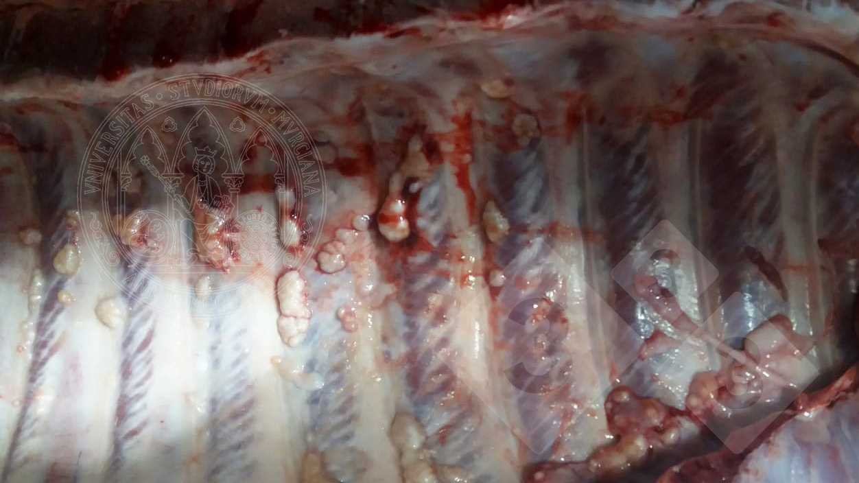 Ci sono lesioni bianco-giallastre, di diverse dimensioni, attaccate al lato interno delle costole di un suino da ingrasso. Sono granulomi tubercolari su una superficie sierosa. I suini sono suscettibili alle infezioni da Mycobacterium bovis, M. tuberculosis e dal complesso M. avium, e le lesioni possono raggiungere queste localizzazioni mediante diffusione ematogena o linfogena retrograda.