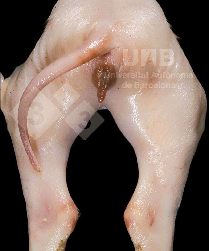 La tumefazione vulvare è una risposta fisiologica agli estrogeni, che succede normalmente, per esempio, durante l'estro. Però occasionalmente questa variazione può essere la conseguenza di un processo patologico. In questo suinetto la lesione è stata provocata da micotossine: alcune possono avere effetti estrogenici, come lo zearalenone, prodotto da diverse specie di Fusarium. Altre cause nelle scrofe possono includere le cisti follicolari o le neoplasie alle ovaie (tumori delle cellule della granulosa).