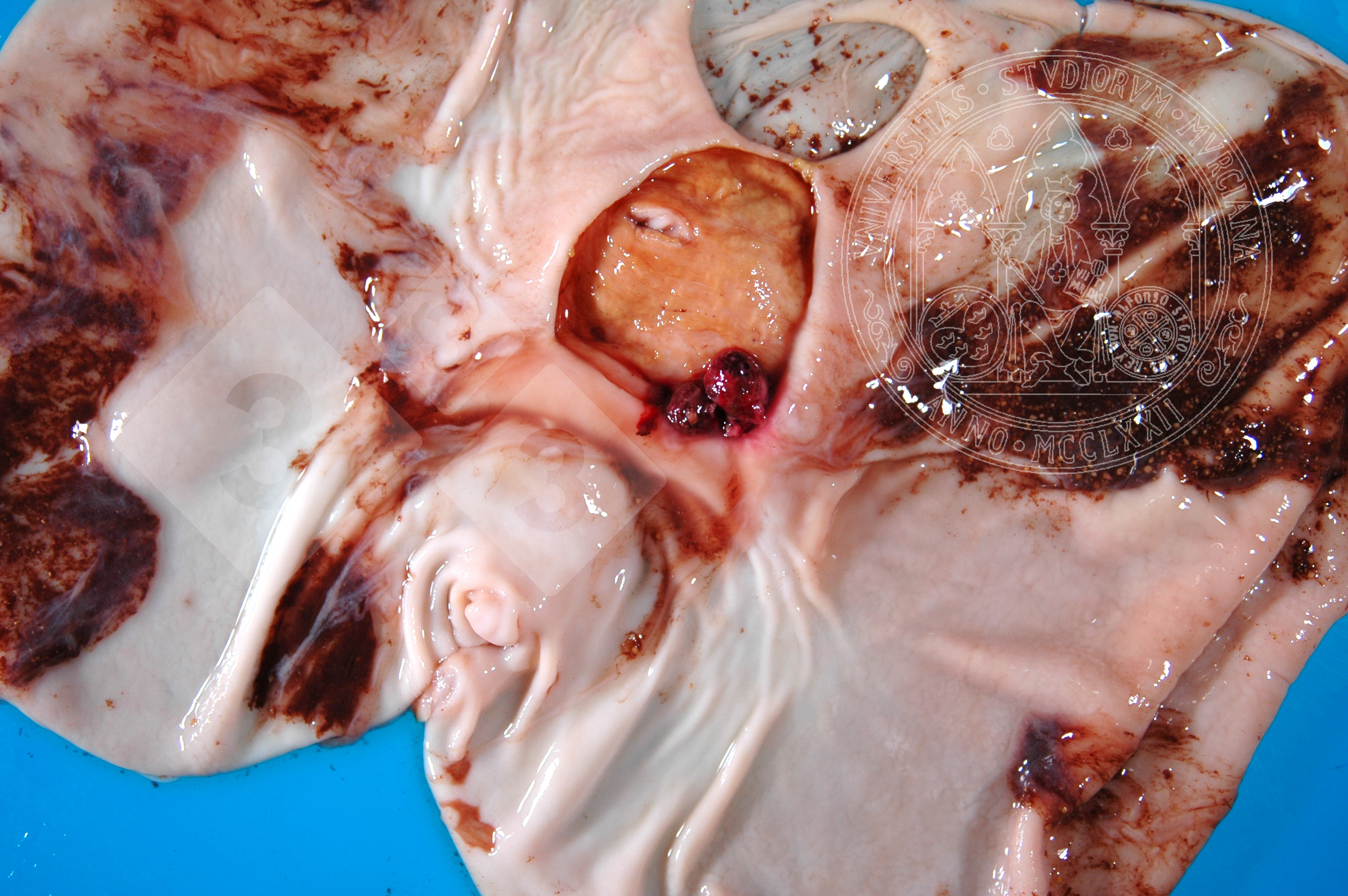 Immagine crateriforme della regione ghiandolare dello stomaco con resti di sangue digerito e non digerito. È un'ulcera cronica, ma la morte dell'animale si è verificata rapidamente a causa di sanguinamento mediante riattivazione dalla rottura dei vasi del tessuto di granulazione sottostante. Le ulcere gastriche sono processi multifattoriali che possono essere influenzati da vari aspetti come la dieta, la razza o l'incrocio genetico, fattori di stress, ecc...