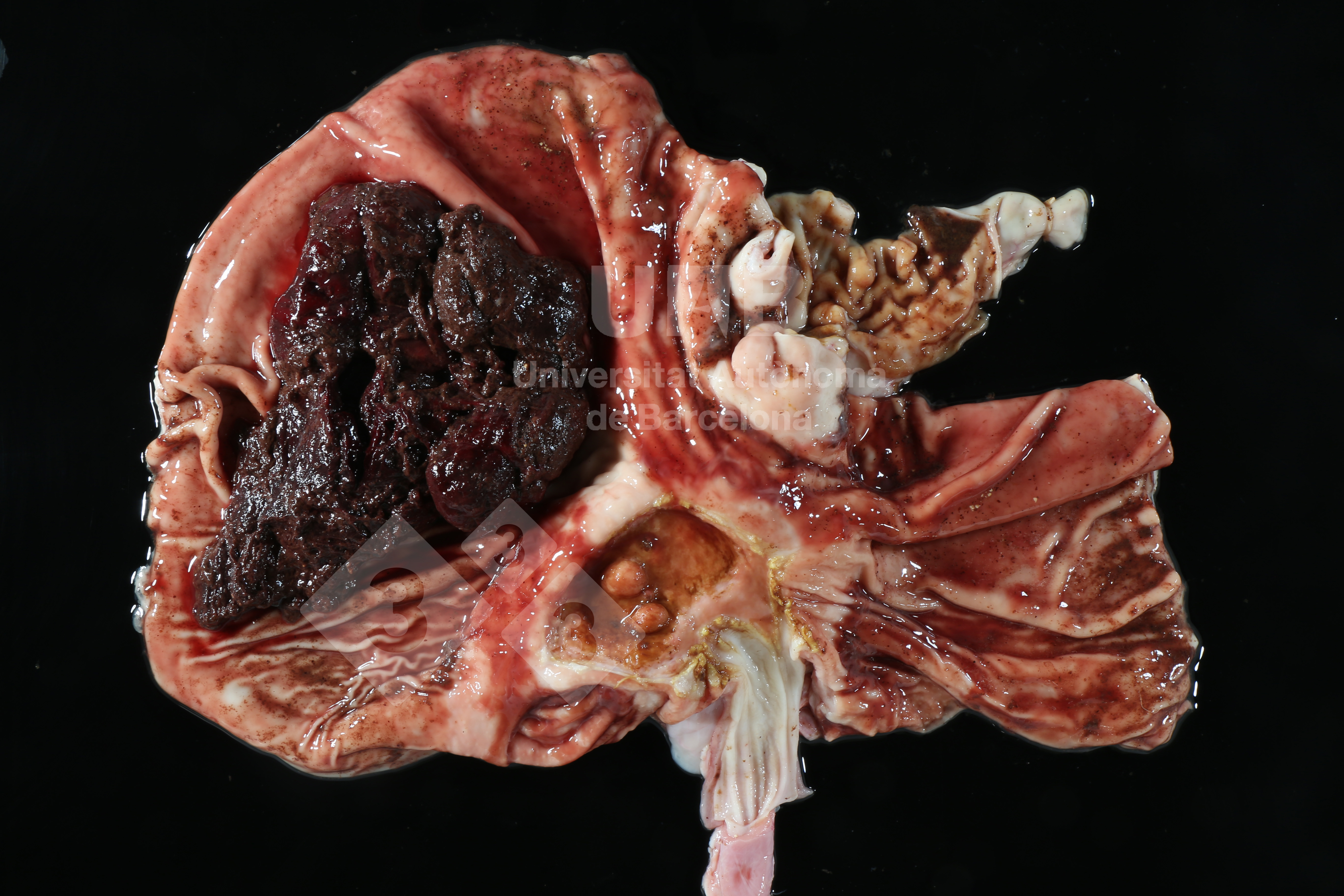 Questo soggetto soffriva di ulcera gastrica cronica grave nella regione "pars esofagica" (cardias). Quest'ulcera normalmente finisce per produrre emorragie intermittenti che in forma acuta causano shock ipovolemico e morte improvisa. Alla necroscopia si osserva ulcera gastrica con contenuto sanguinolento o coaguli (come in questo caso) nel lume gastrico.