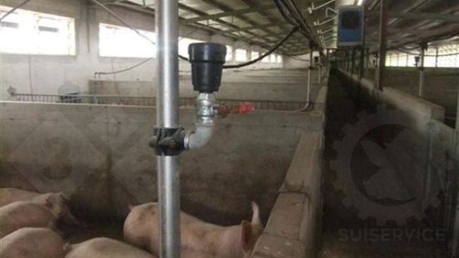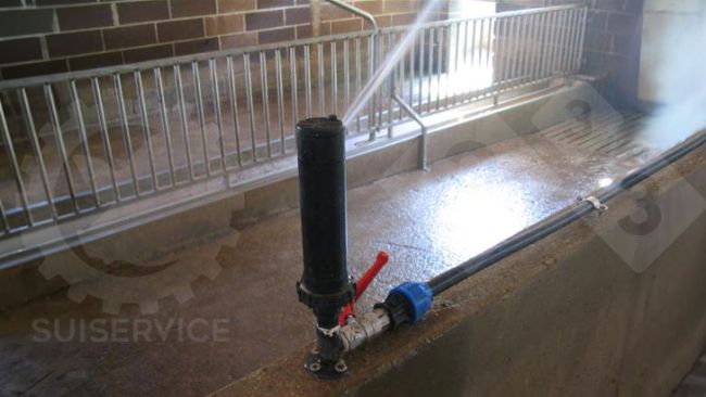 Questo allevatore ha pensato bene di installare degli irrigatori, che all’occorrenza vengono attivati per inumidire la superficie del locare da lavare...
