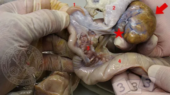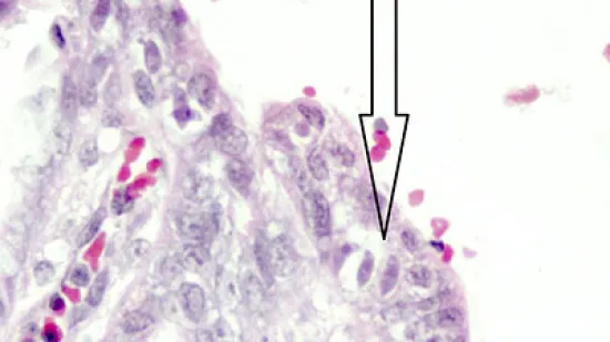 Quale microrganismo (freccia) si trova all'interno della mucosa dell'intestino tenue di questo suinetto con diarrea?