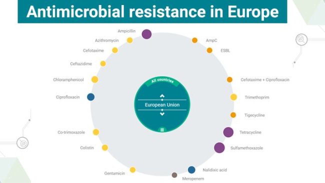 Gli ultimi dati sull'uomo, sugli animali e sugli alimenti mostrano che un'alta percentuale di batteri Salmonella è resistente a più farmaci (resistente a tre o più antimicrobici). Nell'uomo, la resistenza alla ciprofloxacina è comune, in particolare in alcuni tipi di Salmonella, e la resistenza alle alte concentrazioni di ciprofloxacina è generalmente aumentata dall'1,7% (2016) al 4,6% (2018). Per il Campylobacter, 16 paesi su 19 riportano percentuali molto alte o estremamente elevate di resistenza alla ciprofloxacina.